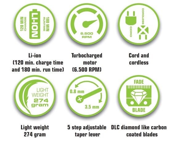 De MONSTERCLIPPER kan worden gebruikt met snoer en draadloos. Volledig opgeladen in 120 minuten en kan 180 minuten worden gebruikt. De tondeuse heeft een zeer krachtige Japanse motor met 6500 RPM en voelt comfortabel in de hand door zijn ergonomische vorm en een licht gewicht van slechts 274 gram!