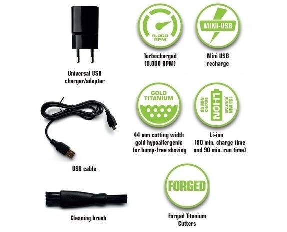 Uitgerust met twee snijmesjes van gesmeed titanium, die zich onder de gouden hypoallergene folies scheerfolie bevinden, zorgen voor een ultra close-cut. Gepaard met een zeer krachtige motor (9.000RPM) biedt de MONSTERSHAVER een irritatie- en bultvrij scheerresultaat.